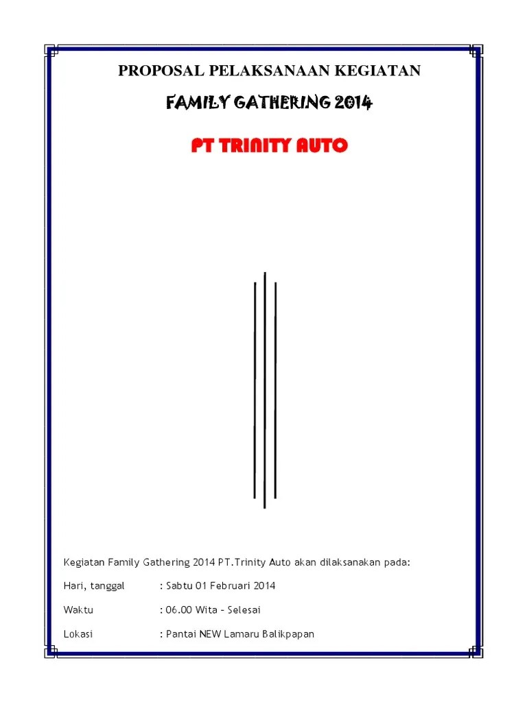 Paid event proposal · first name · last name · home address · email address · phone number · company/ organization name · preferred event date · alternate event date. Proposal family gathering perusahaan susu milkies kampung cikidang lembang (bandung), 16 juni 2012 i. Proposal family gathering perusahaan susu milkies kampung cikidang lembang (bandung), 16 juni 2012 i. Proposal acara family gathering team sanofi operation. Contoh proposal family gathering perusahaan doc. Latar belakang keberlangsungan perusahaan di masa . Rekreasi dalam rangka liburan bersama. Kami dapat bantu buatkan proposal sesuai dengan anggaran yang anda miliki. Contoh proposal kegiatan family gathering, contoh proposal kegiatan, contoh proposal kegiatan 17 agustus, contoh proposal kegiatan sekolah, . Proposal acara family gathering murah, paket wisata outing, outbound, gathering kantor perusahaan, makrab, camping, paket libur natal, tahun baru, . Proposal dalam mengajukan acara family gathering sebuah perusahaan merupakan hal yang wajib dibuat untuk mendapatkan dana dari perusahaan tersebut. Kau sanggup mencari tulisan yg.