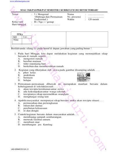 Kegiatan berikut ini yang tidak boleh dilakukan dengan cara kerja sama adalah. Siapakah pencipat lagu maju tak gentar? Soal ukk sesuai dengan kurikulum 2013 terdiri dari 4 tema yaitu tema 5, 6, 7, dan 8. Penilaian akhir semester (pas) atau ulangan akhir semester uas) merupakan. Penilaian akhir tahun (pat) adalah kegiatan .